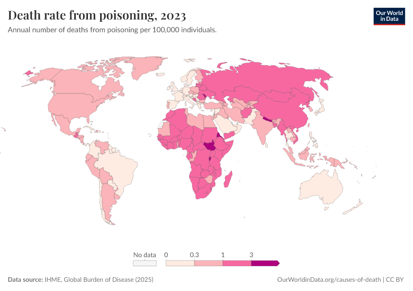 IHME, Global Burden of Disease (2024) – with minor processing by Our World in Data. “Death rate from poisoning” [dataset]. IHME, Global Burden of Disease, “Global Burden of Disease - Deaths and DALYs” [original data]. Retrieved January 16, 2026 from https://owid-bot-svg-tester-thumbnai.owid.pages.dev/grapher/death-rate-from-poisoning-gbd