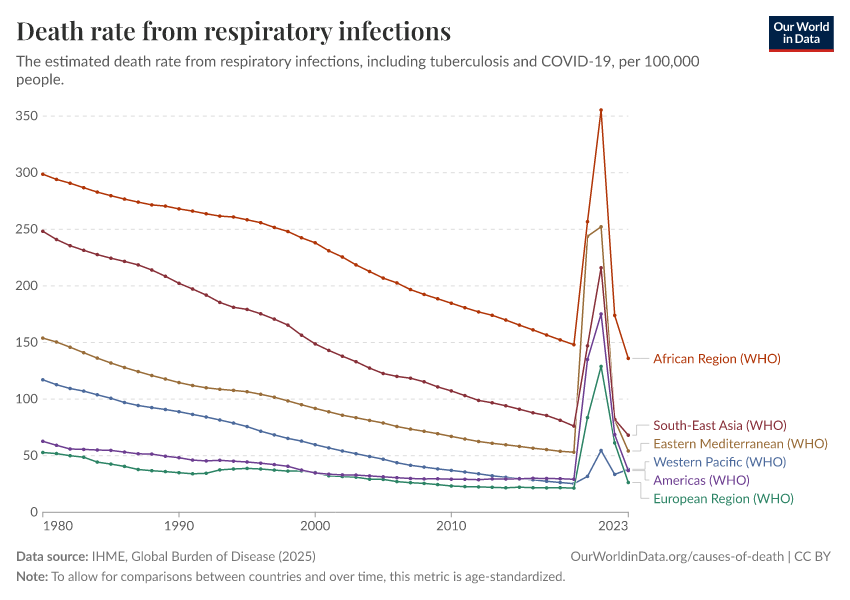 IHME, Global Burden of Disease (2024) – with minor processing by Our World in Data. “Death rate from respiratory infections” [dataset]. IHME, Global Burden of Disease, “Global Burden of Disease - Deaths and DALYs” [original data]. Retrieved January 16, 2026 from https://owid-bot-svg-tester-thumbnai.owid.pages.dev/grapher/death-rate-from-respiratory-infections