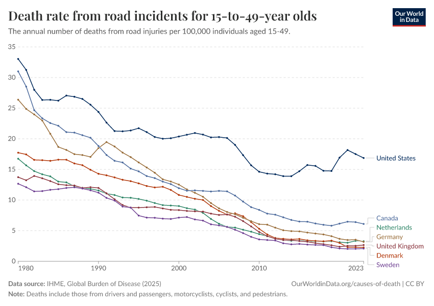 “Data Page: Death rate from road incidents for 15-to-49-year olds”, part of the following publication: Esteban Ortiz-Ospina and Max Roser (2016) - “Global Health”. Data adapted from IHME, Global Burden of Disease. Retrieved from https://owid-bot-svg-tester-thumbnai.owid.pages.dev/grapher/death-rate-from-road-accidents-for-15--to-49-year-olds [online resource]How to cite this data
