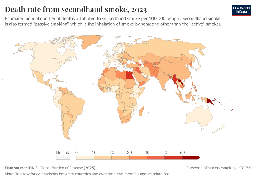 IHME, Global Burden of Disease (2024) – with minor processing by Our World in Data. “Death rate from secondhand smoke” [dataset]. IHME, Global Burden of Disease, “Global Burden of Disease - Risk Factors” [original data]. Retrieved January 16, 2026 from https://owid-bot-svg-tester-thumbnai.owid.pages.dev/grapher/death-rate-from-secondhand-smoke