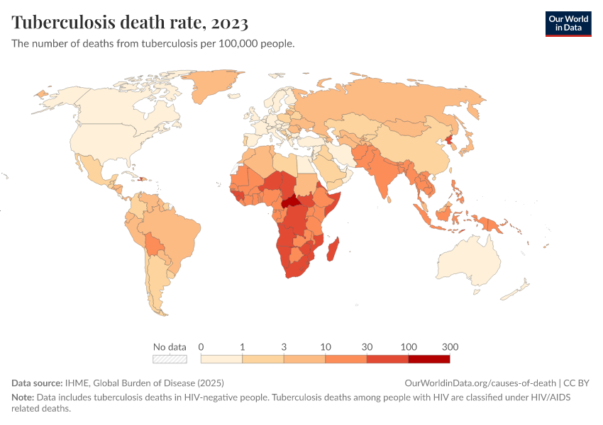 IHME, Global Burden of Disease (2024) – with minor processing by Our World in Data. “Tuberculosis death rate” [dataset]. IHME, Global Burden of Disease, “Global Burden of Disease - Deaths and DALYs” [original data]. Retrieved January 16, 2026 from https://owid-bot-svg-tester-thumbnai.owid.pages.dev/grapher/death-rate-from-tuberculosis-gbd