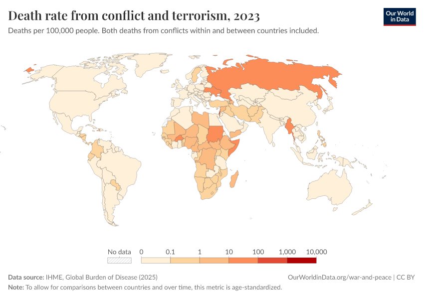 IHME, Global Burden of Disease (2024) – with minor processing by Our World in Data. “Death rate from conflict and terrorism” [dataset]. IHME, Global Burden of Disease, “Global Burden of Disease - Deaths and DALYs” [original data]. Retrieved January 16, 2026 from https://owid-bot-svg-tester-thumbnai.owid.pages.dev/grapher/death-rates-from-conflict-and-terrorism-gbd