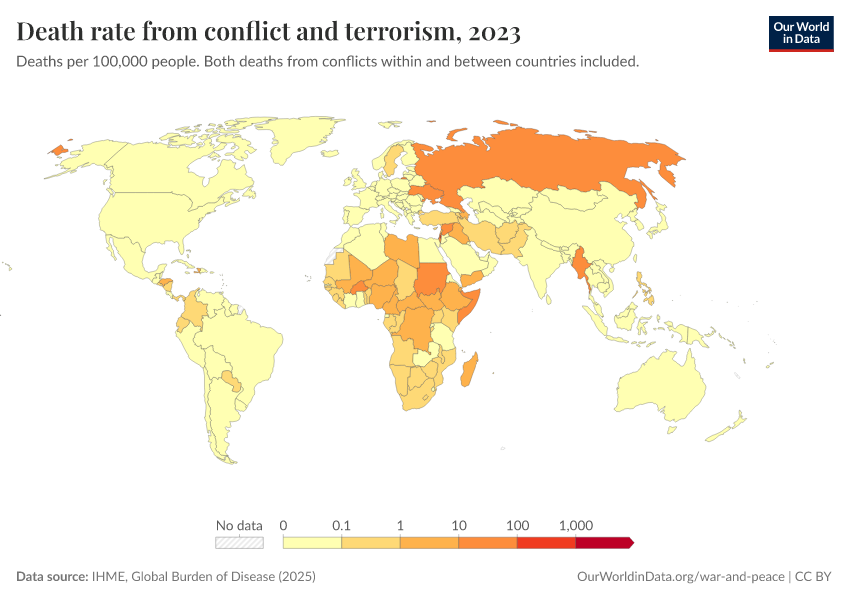 “Data Page: Death rate from conflict and terrorism”, part of the following publication: Esteban Ortiz-Ospina and Max Roser (2016) - “Global Health”. Data adapted from IHME, Global Burden of Disease. Retrieved from https://owid-bot-svg-tester-thumbnai.owid.pages.dev/grapher/deaths-conflict-terrorism-per-100000 [online resource]How to cite this data