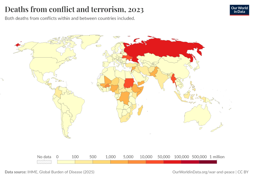 “Data Page: Deaths from conflict and terrorism”, part of the following publication: Esteban Ortiz-Ospina and Max Roser (2016) - “Global Health”. Data adapted from IHME, Global Burden of Disease. Retrieved from https://owid-bot-svg-tester-thumbnai.owid.pages.dev/grapher/deaths-from-conflict-and-terrorism [online resource]How to cite this data