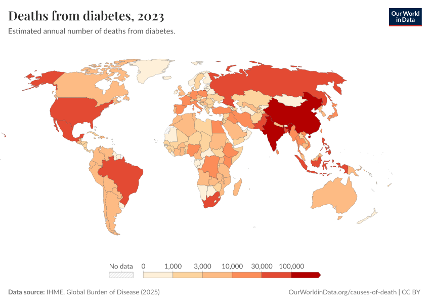 “Data Page: Deaths from diabetes”, part of the following publication: Esteban Ortiz-Ospina and Max Roser (2016) - “Global Health”. Data adapted from IHME, Global Burden of Disease. Retrieved from https://owid-bot-svg-tester-thumbnai.owid.pages.dev/grapher/deaths-from-diabetes [online resource]How to cite this data