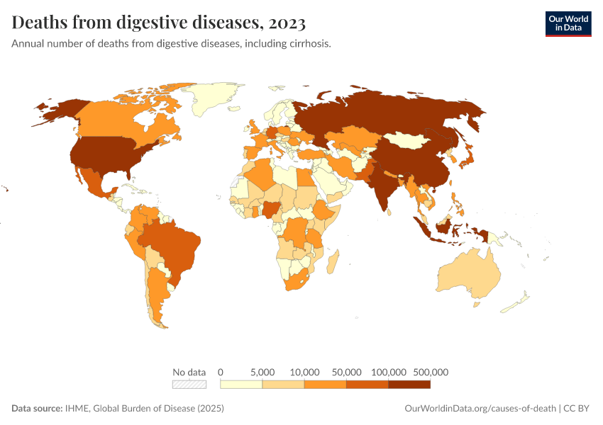 “Data Page: Deaths from digestive diseases”, part of the following publication: Esteban Ortiz-Ospina and Max Roser (2016) - “Global Health”. Data adapted from IHME, Global Burden of Disease. Retrieved from https://owid-bot-svg-tester-thumbnai.owid.pages.dev/grapher/deaths-from-digestive-diseases [online resource]How to cite this data