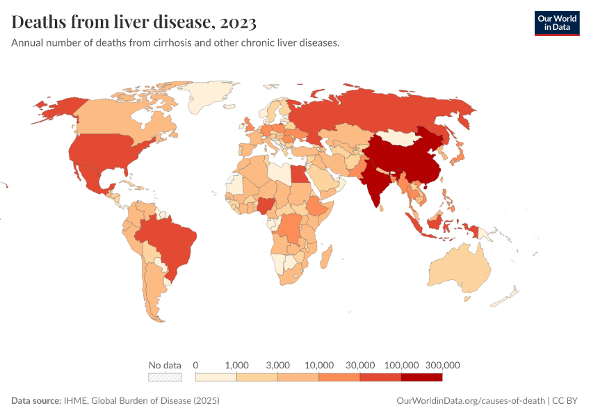 IHME, Global Burden of Disease (2024) – with minor processing by Our World in Data. “Deaths from liver disease” [dataset]. IHME, Global Burden of Disease, “Global Burden of Disease - Deaths and DALYs” [original data]. Retrieved January 16, 2026 from https://owid-bot-svg-tester-thumbnai.owid.pages.dev/grapher/deaths-from-liver-disease