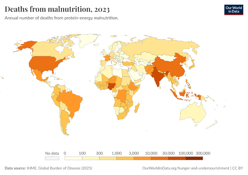 IHME, Global Burden of Disease (2024) – with minor processing by Our World in Data. “Deaths from malnutrition” [dataset]. IHME, Global Burden of Disease, “Global Burden of Disease - Deaths and DALYs” [original data]. Retrieved January 16, 2026 from https://owid-bot-svg-tester-thumbnai.owid.pages.dev/grapher/deaths-from-malnutrition