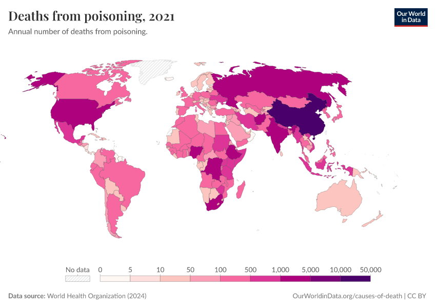 World Health Organization (2024) – with major processing by Our World in Data. “Deaths from poisoning” [dataset]. World Health Organization, “Global Health Estimates” [original data]. Retrieved January 16, 2026 from https://owid-bot-svg-tester-thumbnai.owid.pages.dev/grapher/deaths-from-poisonings-ghe
