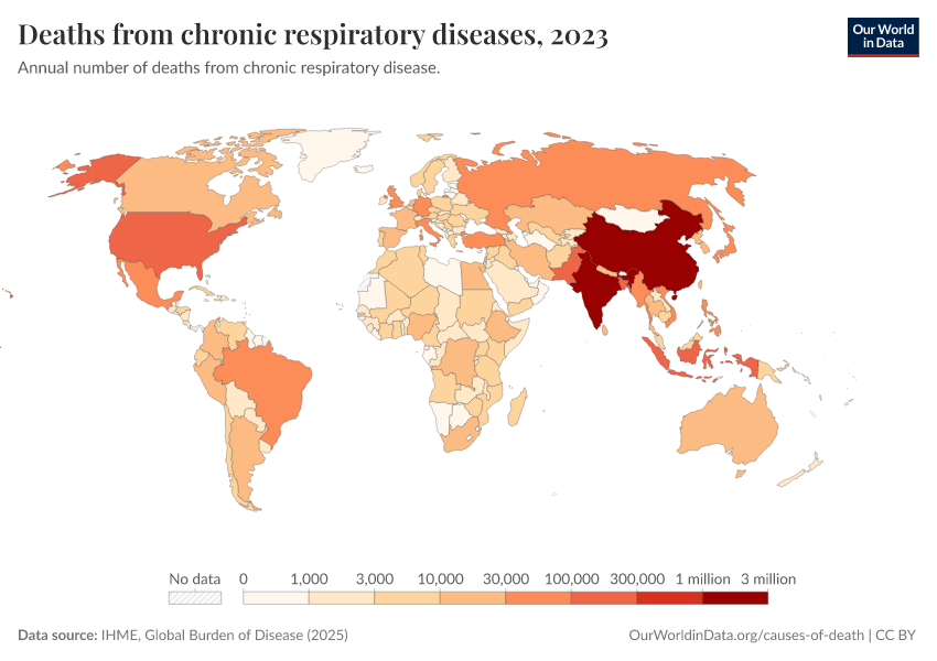 “Data Page: Deaths from chronic respiratory diseases”, part of the following publication: Esteban Ortiz-Ospina and Max Roser (2016) - “Global Health”. Data adapted from IHME, Global Burden of Disease. Retrieved from https://owid-bot-svg-tester-thumbnai.owid.pages.dev/grapher/deaths-from-respiratory-disease [online resource]How to cite this data