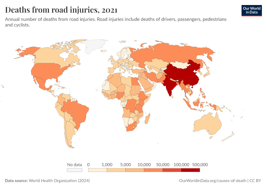 World Health Organization (2024) – with major processing by Our World in Data. “Deaths from road injuries” [dataset]. World Health Organization, “Global Health Estimates” [original data]. Retrieved January 16, 2026 from https://owid-bot-svg-tester-thumbnai.owid.pages.dev/grapher/deaths-from-road-injuries