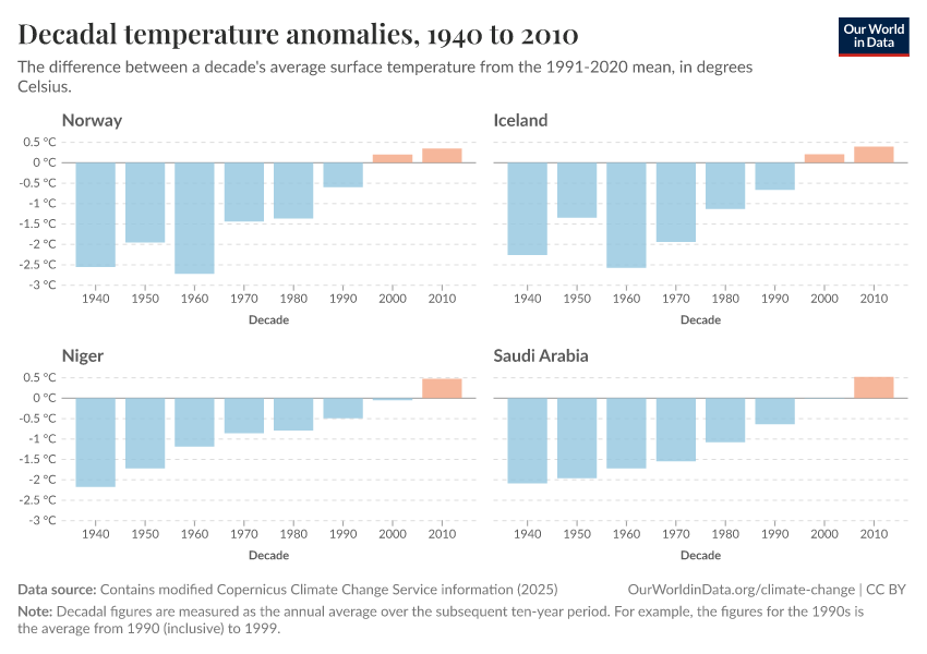 “Data Page: Decadal temperature anomalies”, part of the following publication: Hannah Ritchie, Pablo Rosado, and Veronika Samborska (2024) - “Climate Change”. Data adapted from Contains modified Copernicus Climate Change Service information. Retrieved from https://owid-bot-svg-tester-thumbnai.owid.pages.dev/grapher/decadal-temperature-anomaly [online resource]