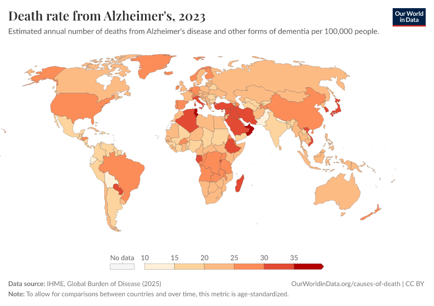 “Data Page: Death rate from Alzheimer's”, part of the following publication: Esteban Ortiz-Ospina and Max Roser (2016) - “Global Health”. Data adapted from IHME, Global Burden of Disease. Retrieved from https://owid-bot-svg-tester-thumbnai.owid.pages.dev/grapher/dementia-death-rates [online resource]How to cite this data