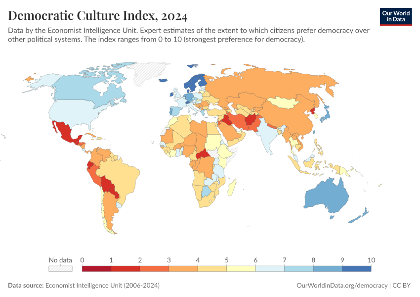 “Data Page: Democratic Culture Index”, part of the following publication: Bastian Herre, Lucas Rodés-Guirao, and Esteban Ortiz-Ospina (2013) - “Democracy”. Data adapted from Economist Intelligence Unit, Gapminder, Various sources. Retrieved from https://owid-bot-svg-tester-thumbnai.owid.pages.dev/grapher/democratic-culture-index-eiu [online resource]How to cite this data