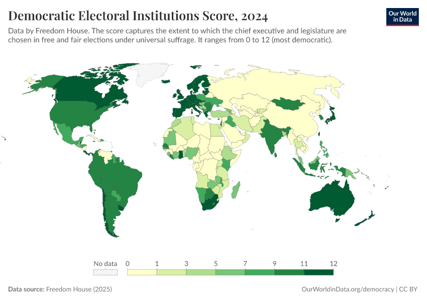 Freedom House (2025) – processed by Our World in Data. “Democratic electoral institutions score” [dataset]. Freedom House, “Freedom in the World” [original data]. Retrieved January 16, 2026 from https://owid-bot-svg-tester-thumbnai.owid.pages.dev/grapher/democratic-electoral-institutions-fh