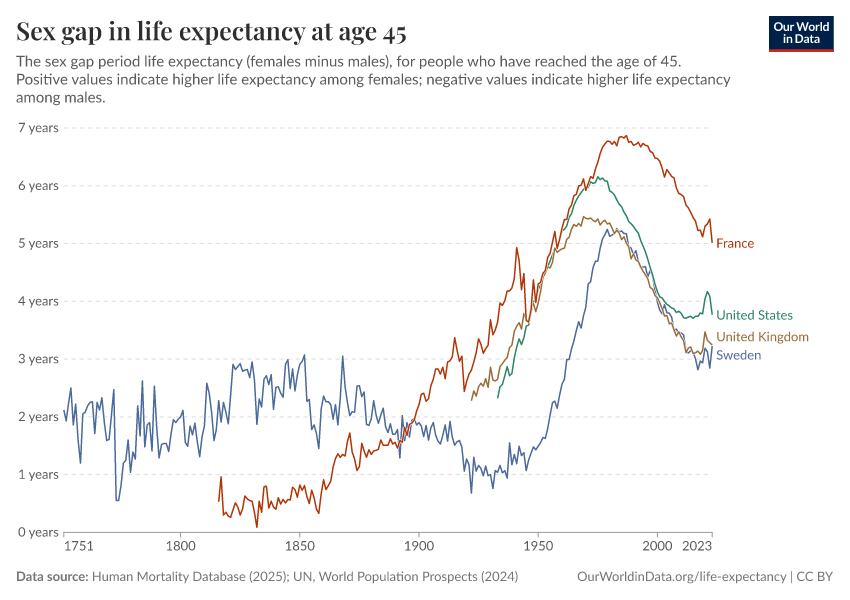 Human Mortality Database (2025); UN, World Population Prospects (2024) – with major processing by Our World in Data. “Life expectancy at 45 – HMD – female-male difference, period tables” [dataset]. Human Mortality Database, “Human Mortality Database”; United Nations, “World Population Prospects” [original data]. Retrieved January 16, 2026 from https://owid-bot-svg-tester-thumbnai.owid.pages.dev/grapher/difference-in-female-and-male-life-expectancy-at-age-45