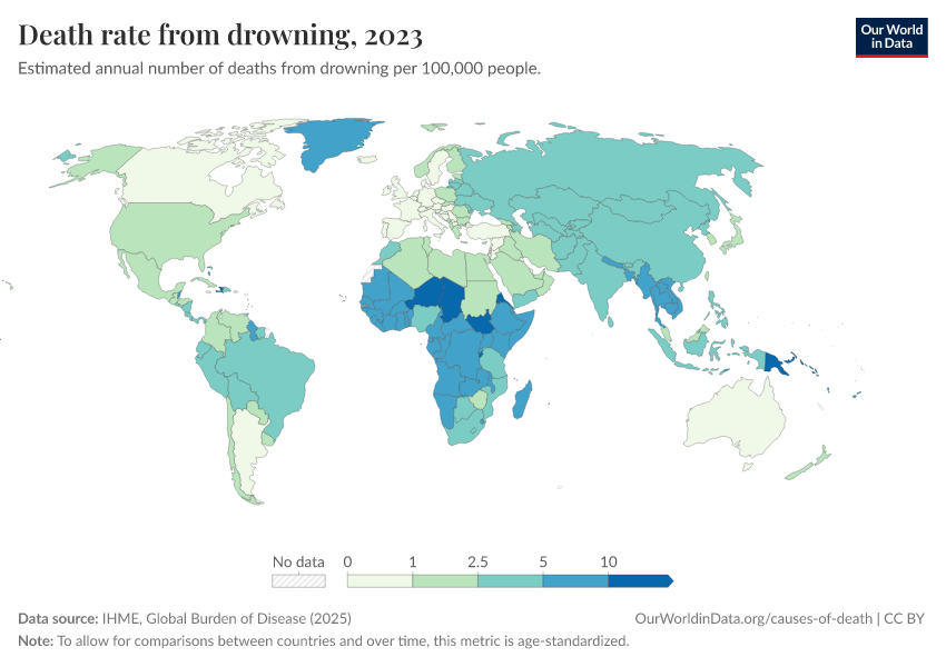 “Data Page: Death rate from drowning”, part of the following publication: Esteban Ortiz-Ospina and Max Roser (2016) - “Global Health”. Data adapted from IHME, Global Burden of Disease. Retrieved from https://owid-bot-svg-tester-thumbnai.owid.pages.dev/grapher/drowning-death-rates [online resource]How to cite this data