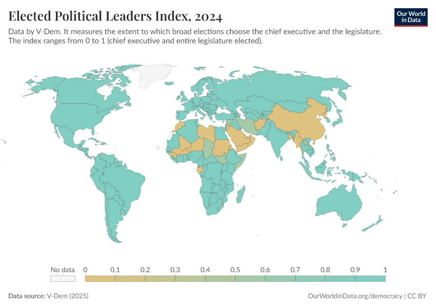 “Data Page: Elected officials index”, part of the following publication: Bastian Herre, Lucas Rodés-Guirao, and Esteban Ortiz-Ospina (2013) - “Democracy”. Data adapted from V-Dem. Retrieved from https://owid-bot-svg-tester-thumbnai.owid.pages.dev/grapher/elected-political-leaders-index [online resource]How to cite this data