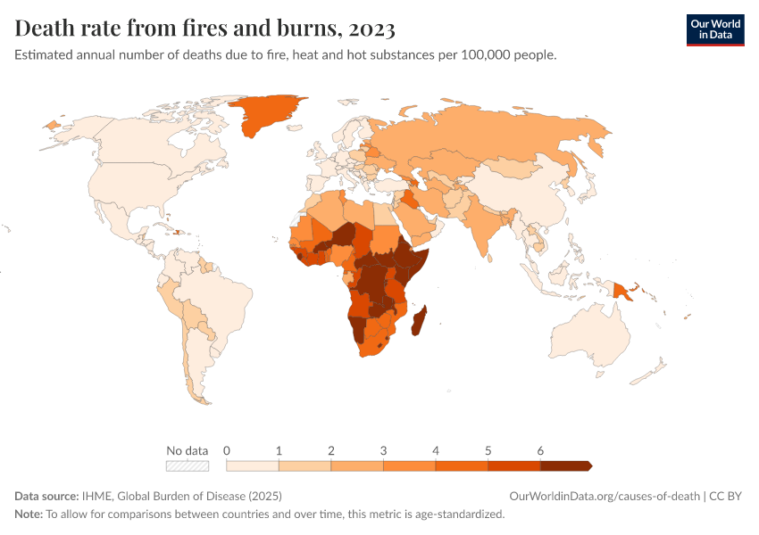 “Data Page: Death rate from fires and burns”, part of the following publication: Esteban Ortiz-Ospina and Max Roser (2016) - “Global Health”. Data adapted from IHME, Global Burden of Disease. Retrieved from https://owid-bot-svg-tester-thumbnai.owid.pages.dev/grapher/fire-death-rates [online resource]How to cite this data