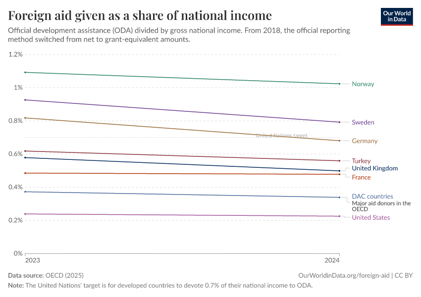 “Data Page: Foreign aid given as a share of national income”, part of the following publication: Bastian Herre, Pablo Arriagada, Simon van Teutem, and Hannah Ritchie (2024) - “Foreign Aid”. Data adapted from OECD. Retrieved from https://owid-bot-svg-tester-thumbnai.owid.pages.dev/grapher/foreign-aid-given-as-a-share-of-national-income [online resource]How to cite this data