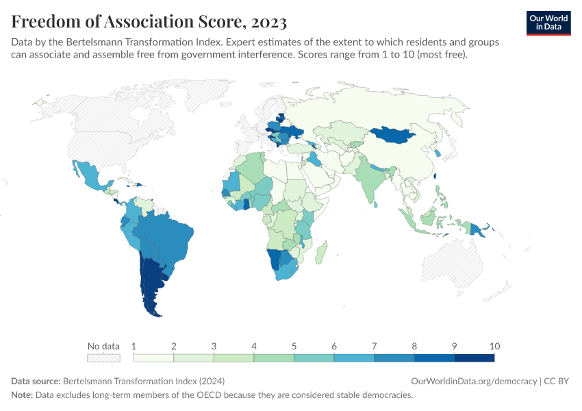 “Data Page: Freedom of association score”, part of the following publication: Bastian Herre, Lucas Rodés-Guirao, and Esteban Ortiz-Ospina (2013) - “Democracy”. Data adapted from Bertelsmann Transformation Index. Retrieved from https://owid-bot-svg-tester-thumbnai.owid.pages.dev/grapher/freedom-of-association-score-bti [online resource]How to cite this data