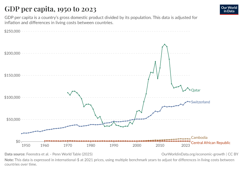“Data Page: GDP per capita”, part of the following publication: Max Roser, Bertha Rohenkohl, Pablo Arriagada, Joe Hasell, Hannah Ritchie, and Esteban Ortiz-Ospina (2023) - “Economic Growth”. Data adapted from Feenstra et al.. Retrieved from https://owid-bot-svg-tester-thumbnai.owid.pages.dev/grapher/gdp-per-capita-penn-world-table [online resource]How to cite this data