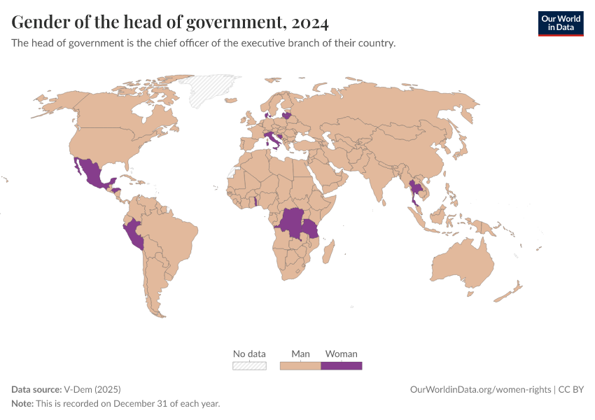 “Data Page: Gender of the head of government”, part of the following publication: Bastian Herre, Lucas Rodés-Guirao, and Esteban Ortiz-Ospina (2013) - “Democracy”. Data adapted from V-Dem. Retrieved from https://owid-bot-svg-tester-thumbnai.owid.pages.dev/grapher/gender-of-the-head-of-government [online resource]How to cite this data