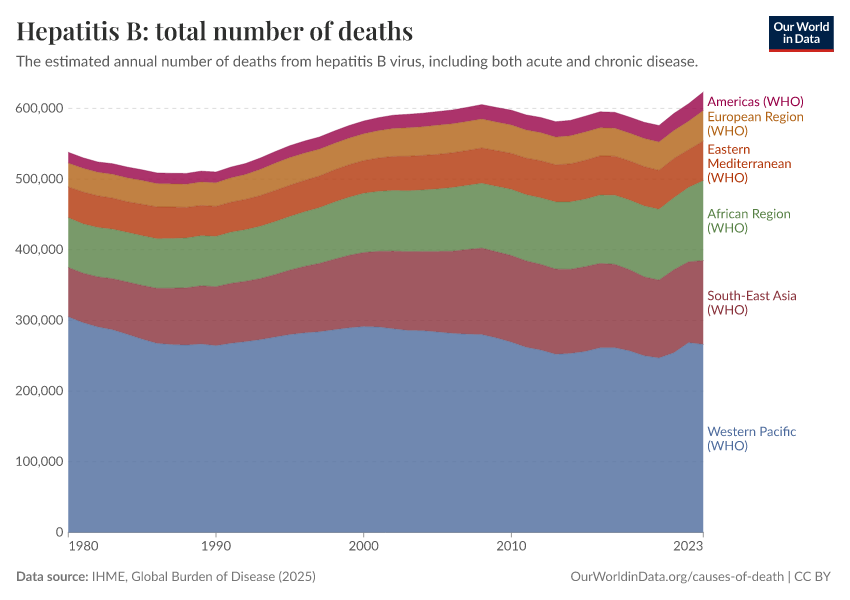 “Data Page: Hepatitis B: total number of deaths”, part of the following publication: Esteban Ortiz-Ospina and Max Roser (2016) - “Global Health”. Data adapted from IHME, Global Burden of Disease. Retrieved from https://owid-bot-svg-tester-thumbnai.owid.pages.dev/grapher/hepatitis-b-number-of-deaths [online resource]How to cite this data