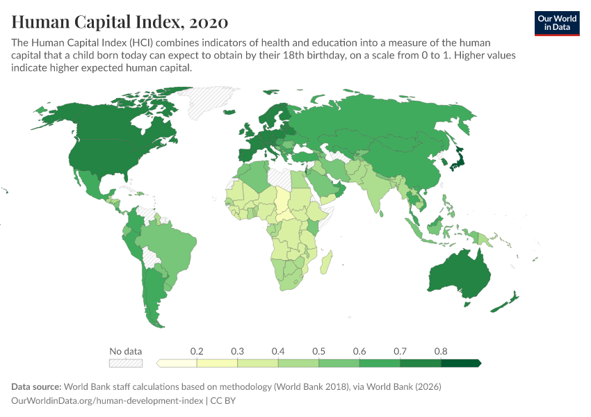 “Data Page: Human Capital Index”. Our World in Data (2026). Data adapted from World Bank staff calculations based on methodology (World Bank 2018), via World Bank. Retrieved from https://owid-bot-svg-tester-thumbnai.owid.pages.dev/grapher/human-capital-index-in-2018 [online resource]How to cite this data
