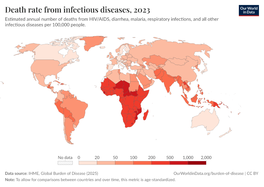 IHME, Global Burden of Disease (2024) – with minor processing by Our World in Data. “Death rate from infectious diseases” [dataset]. IHME, Global Burden of Disease, “Global Burden of Disease - Deaths and DALYs” [original data]. Retrieved January 16, 2026 from https://owid-bot-svg-tester-thumbnai.owid.pages.dev/grapher/infectious-disease-death-rates