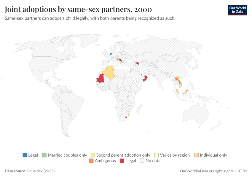 “Data Page: Joint adoptions by same-sex partners”, part of the following publication: Bastian Herre and Pablo Arriagada (2023) - “LGBT+ Rights”. Data adapted from Equaldex. Retrieved from https://owid-bot-svg-tester-thumbnai.owid.pages.dev/grapher/joint-adoptions-same-sex-partners-equaldex [online resource]How to cite this data