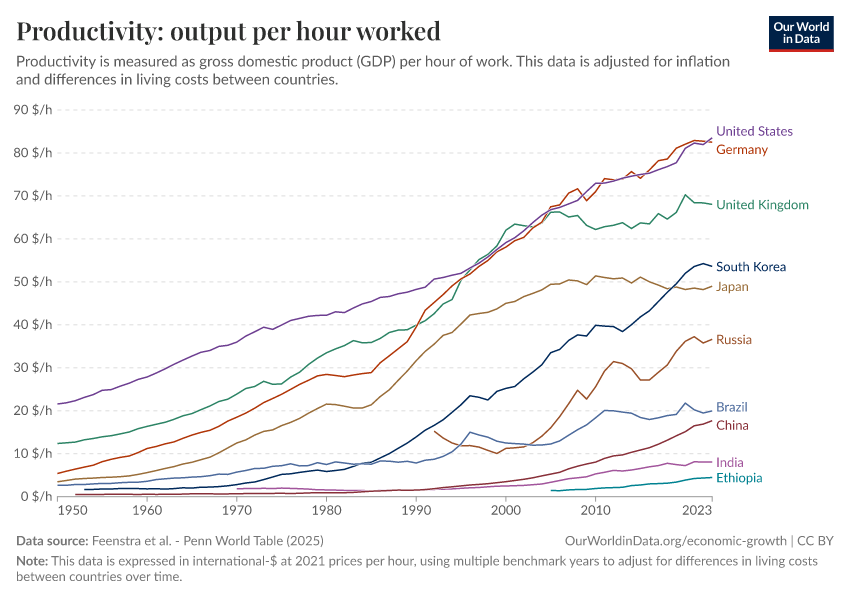 “Data Page: Productivity: output per hour worked”, part of the following publication: Max Roser, Bertha Rohenkohl, Pablo Arriagada, Joe Hasell, Hannah Ritchie, and Esteban Ortiz-Ospina (2023) - “Economic Growth”. Data adapted from Feenstra et al.. Retrieved from https://owid-bot-svg-tester-thumbnai.owid.pages.dev/grapher/labor-productivity-per-hour-pennworldtable [online resource]How to cite this data
