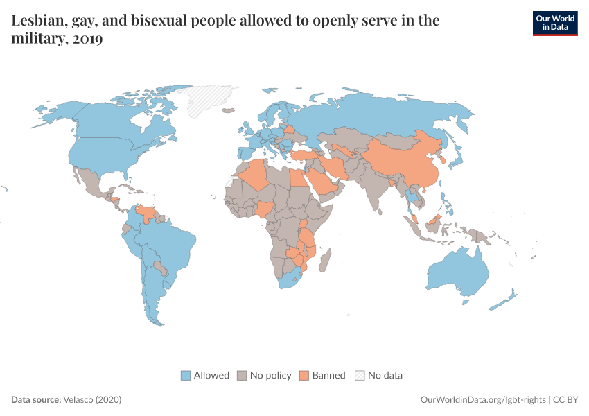 “Data Page: Lesbian, gay, and bisexual people allowed to openly serve in the military”, part of the following publication: Bastian Herre and Pablo Arriagada (2023) - “LGBT+ Rights”. Data adapted from Velasco. Retrieved from https://owid-bot-svg-tester-thumbnai.owid.pages.dev/grapher/lgb-military-velasco [online resource]How to cite this data