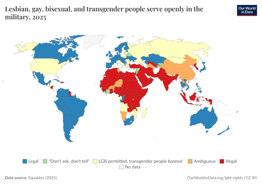 “Data Page: Lesbian, gay, bisexual, and transgender people serve openly in the military”, part of the following publication: Bastian Herre and Pablo Arriagada (2023) - “LGBT+ Rights”. Data adapted from Equaldex. Retrieved from https://owid-bot-svg-tester-thumbnai.owid.pages.dev/grapher/lgbt-military-equaldex [online resource]How to cite this data