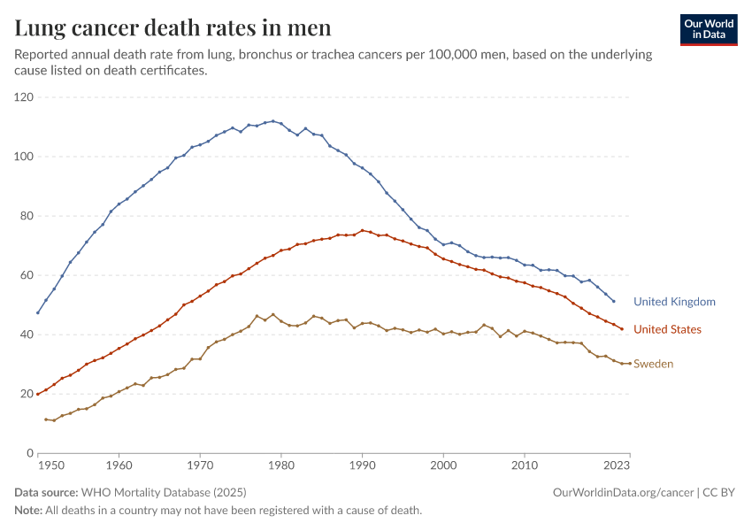 WHO Mortality Database (2025) – with minor processing by Our World in Data. “Lung cancer death rates in men” [dataset]. WHO Mortality Database, “WHO Mortality Database” [original data]. Retrieved January 16, 2026 from https://owid-bot-svg-tester-thumbnai.owid.pages.dev/grapher/lung-cancer-death-rates-males