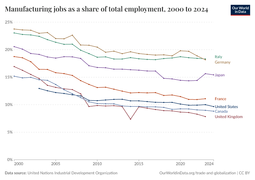 “Data Page: Manufacturing jobs as a share of total employment”. Our World in Data (2026). Data adapted from United Nations Industrial Development Organization. Retrieved from https://owid-bot-svg-tester-thumbnai.owid.pages.dev/grapher/manufacturing-share-of-total-employment [online resource]How to cite this data