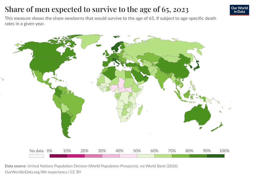 “Data Page: Share of men expected to survive to the age of 65”. Our World in Data (2026). Data adapted from United Nations Population Division (World Population Prospects), via World Bank. Retrieved from https://owid-bot-svg-tester-thumbnai.owid.pages.dev/grapher/men-survival-to-age-65 [online resource]How to cite this data