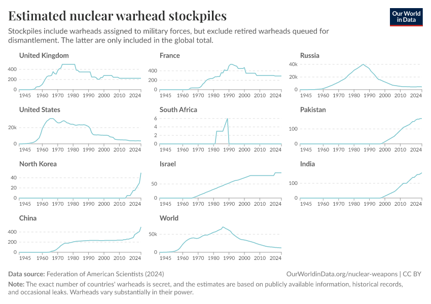 Federation of American Scientists (2024) – with minor processing by Our World in Data. “Estimated nuclear warhead stockpiles” [dataset]. Federation of American Scientists, “Estimated Global Nuclear Warhead Inventories” [original data]. Retrieved January 16, 2026 from https://owid-bot-svg-tester-thumbnai.owid.pages.dev/grapher/nuclear-warhead-stockpiles-lines