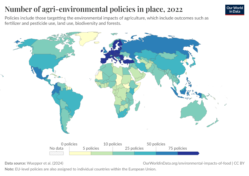 “Data Page: Number of agri-environmental policies in place”. Our World in Data (2026). Data adapted from Wuepper et al. (2024). Retrieved from https://owid-bot-svg-tester-thumbnai.owid.pages.dev/grapher/number-agri-environmental-policies [online resource]How to cite this data