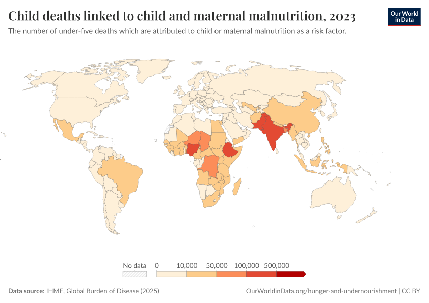 “Data Page: Child deaths linked to child and maternal malnutrition”, part of the following publication: Esteban Ortiz-Ospina and Max Roser (2016) - “Global Health”. Data adapted from IHME, Global Burden of Disease. Retrieved from https://owid-bot-svg-tester-thumbnai.owid.pages.dev/grapher/number-child-deaths-malnutrition [online resource]How to cite this data
