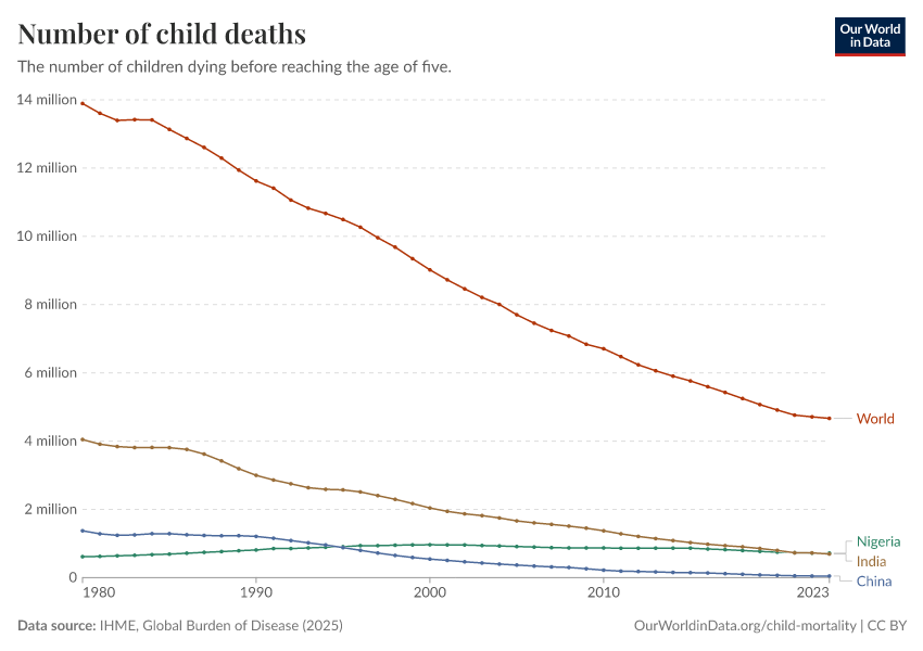 IHME, Global Burden of Disease (2024) – with minor processing by Our World in Data. “Number of child deaths” [dataset]. IHME, Global Burden of Disease, “Global Burden of Disease - Deaths and DALYs” [original data]. Retrieved January 16, 2026 from https://owid-bot-svg-tester-thumbnai.owid.pages.dev/grapher/number-of-child-deaths