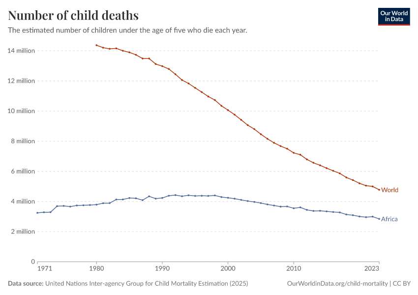 United Nations Inter-agency Group for Child Mortality Estimation (2025) – with major processing by Our World in Data. “Under-five deaths” [dataset]. United Nations Inter-agency Group for Child Mortality Estimation, “United Nations Inter-agency Group for Child Mortality Estimation”; Various sources, “Population” [original data]. Retrieved January 16, 2026 from https://owid-bot-svg-tester-thumbnai.owid.pages.dev/grapher/number-of-child-deaths-igme