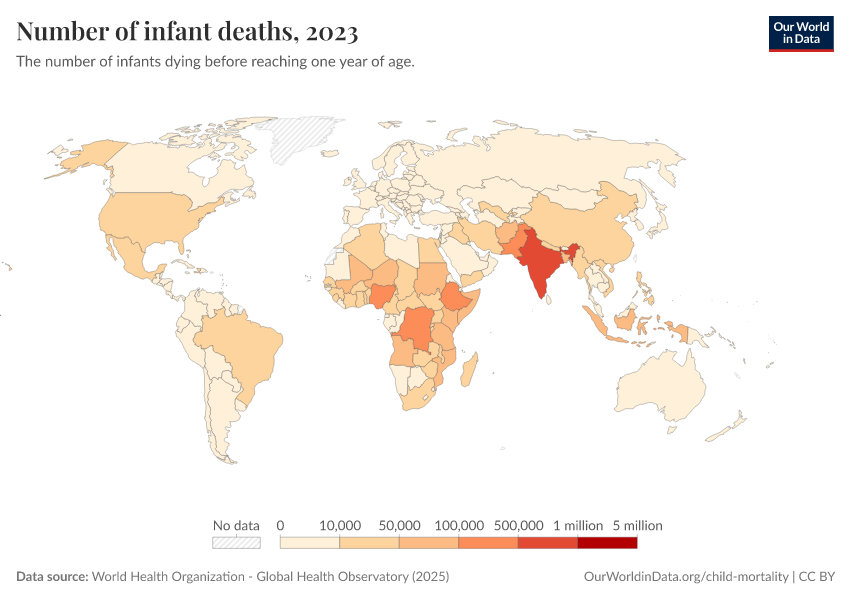 World Health Organization - Global Health Observatory (2025) – processed by Our World in Data. “Number of infant deaths” [dataset]. World Health Organization, “Global Health Observatory” [original data]. Retrieved January 16, 2026 from https://owid-bot-svg-tester-thumbnai.owid.pages.dev/grapher/number-of-infant-deaths-gho