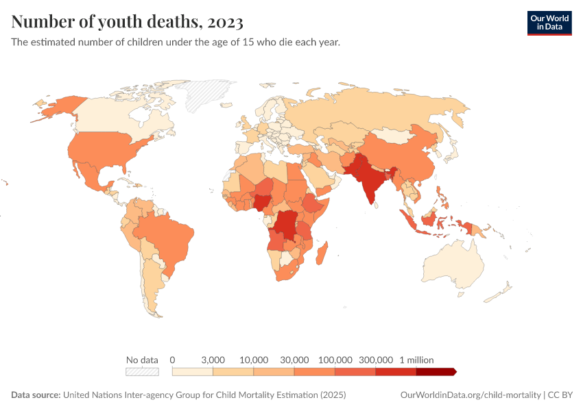 “Data Page: Under-fifteen deaths”, part of the following publication: Saloni Dattani, Fiona Spooner, Hannah Ritchie, and Max Roser (2023) - “Child and Infant Mortality”. Data adapted from United Nations Inter-agency Group for Child Mortality Estimation, UN Inter-agency Group for Child Mortality Estimation, Various sources. Retrieved from https://owid-bot-svg-tester-thumbnai.owid.pages.dev/grapher/number-of-youth-deaths [online resource]
