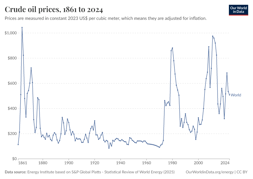 “Data Page: Oil price - Crude prices since 1861”, part of the following publication: Hannah Ritchie, Pablo Rosado, and Max Roser (2023) - “Energy”. Data adapted from Energy Institute. Retrieved from https://owid-bot-svg-tester-thumbnai.owid.pages.dev/grapher/oil-prices-inflation-adjusted [online resource]How to cite this data