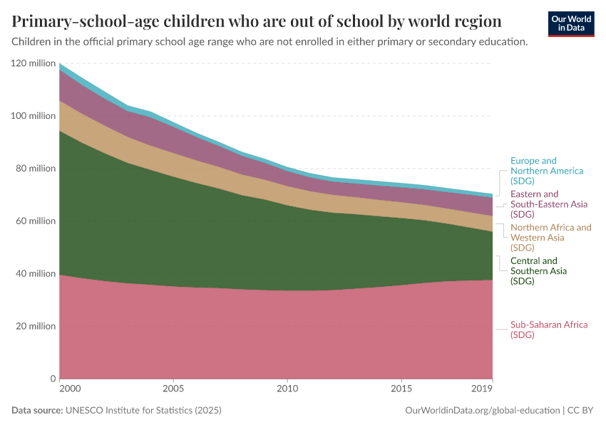“Data Page: Out-of-school children of primary school age”, part of the following publication: Hannah Ritchie, Veronika Samborska, Esteban Ortiz-Ospina, and Max Roser (2023) - “Global Education”. Data adapted from UNESCO Institute for Statistics. Retrieved from https://owid-bot-svg-tester-thumbnai.owid.pages.dev/grapher/out-of-school-children-of-primary-school-age-by-world-region [online resource]How to cite this data