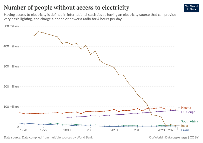 “Data Page: Number of people without access to electricity”, part of the following publication: Hannah Ritchie, Pablo Rosado, and Max Roser (2019) - “Access to Energy”. Data adapted from SDG 7.1.1 Electrification Dataset, World Bank, via World Bank, United Nations Population Division, national statistical offices, and Eurostat, via World Bank. Retrieved from https://owid-bot-svg-tester-thumbnai.owid.pages.dev/grapher/people-without-electricity-country [online resource]How to cite this data