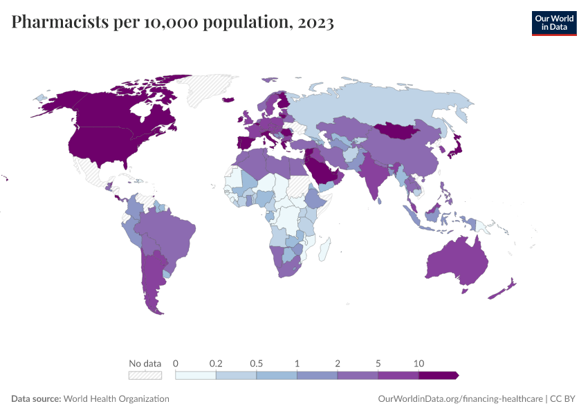 “Data Page: Pharmacists per 10,000 population”. Our World in Data (2026). Data adapted from World Health Organization. Retrieved from https://owid-bot-svg-tester-thumbnai.owid.pages.dev/grapher/pharmaceutical-personnel-per-1000 [online resource]How to cite this data