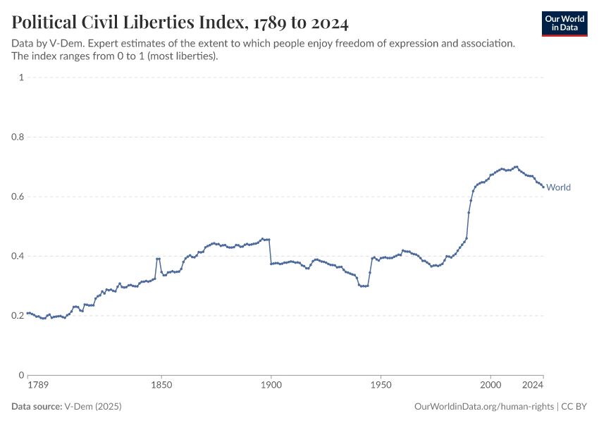 V-Dem (2025) – processed by Our World in Data. “Political civil liberties index – V-Dem” [dataset]. V-Dem, “Democracy report v15” [original data]. Retrieved January 16, 2026 from https://owid-bot-svg-tester-thumbnai.owid.pages.dev/grapher/political-civil-liberties-index