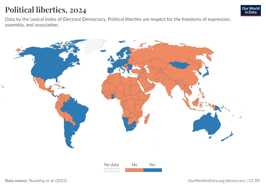 “Data Page: Political liberties”, part of the following publication: Bastian Herre, Lucas Rodés-Guirao, and Esteban Ortiz-Ospina (2013) - “Democracy”. Data adapted from Skaaning et al.. Retrieved from https://owid-bot-svg-tester-thumbnai.owid.pages.dev/grapher/political-liberties-lexical [online resource]How to cite this data
